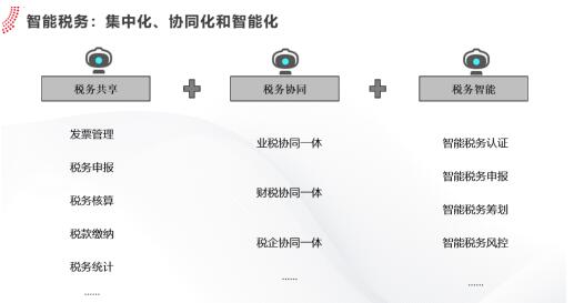 智能税务包括:税务的基础工作集中规模化处理,如,发票开具、认证、税务申报、税务核算、税款缴纳、税务统计等工作,让税务管理人员从简单、重复的基础涉税业务中解脱出来,聚焦于企业经营数据的分析与预测,融合业务和财务数据,开展税务筹划、风险防控和价值创造;以业务流程为主线,将税务管理与控制嵌入企业生产经营全过程,实现业财税协同一体化,另一方面,通过统一税收政策执行标准,统一税企数据交互标准,实现税企协同一体化;通过企业财务系统与金税系统直连或引入RPA,实现发票管理及纳税申报智能化,充分利用大数据和大数据分析平台,对企业税收风险进行分析识别并提出应对建议策略,实现风险管理智能化。