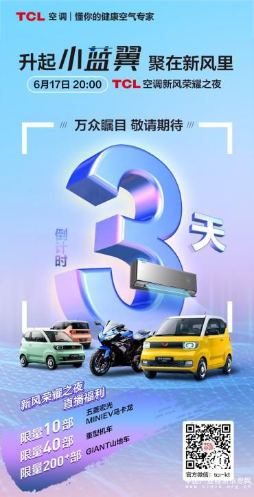 五菱宏光MINIEV马卡龙、重型机车、品牌山地车随心送!究竟是什么直播活动如此豪横?6月17日20:00, TCL空调将重磅打造新风荣耀之夜,渠道直播专场即将开启。升起小蓝翼,为回馈广大渠道好友的支持,TCL卧室新风空调邀请各渠道好友“聚在新风里”。万众瞩目,敬请期待!