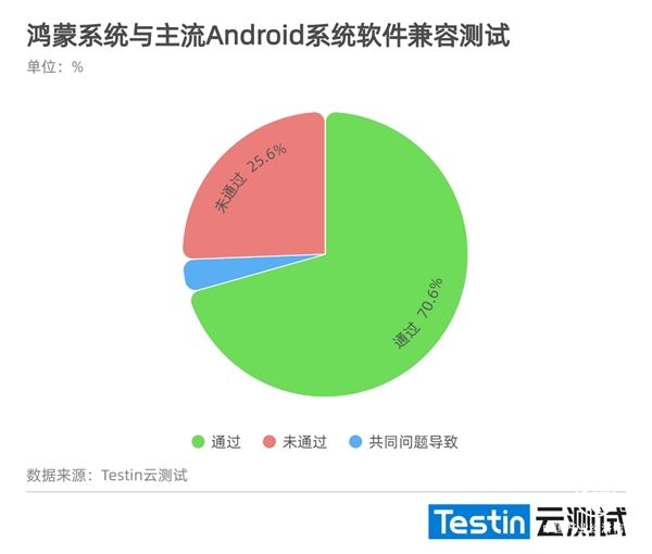 2、鸿蒙系统与市面上主流的Android系统软件兼容测试结果中,通过率超过70%,但拥抱鸿蒙系统仍需第一时间关注兼容适配测试。