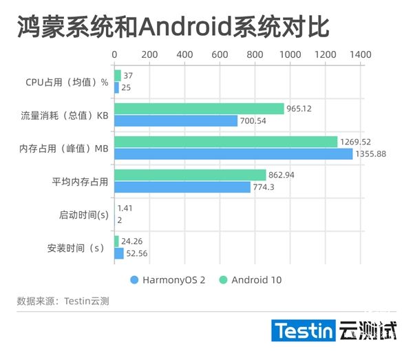 在相同型号手机(P40 PRO)上分别安装Android 10和HarmonyOS 2.0系统,对随机选取的多个App进行同环境、同脚本下的测试,最终Android 10和HarmonyOS 2.0系统表现非常接近。需要说明的是本次为个体测试,不代表全面数据,而通过对多次对比的枕头数据分析结果和该结论类似,但HarmonyOS 2.0系统在降低资源消耗方面确实略有优势。