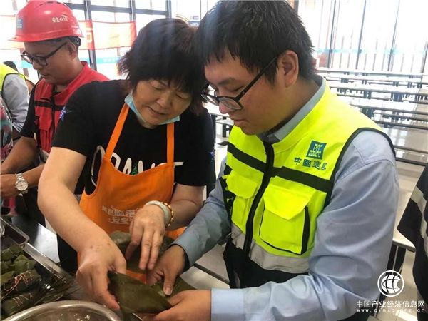 捋粽叶、填糯米、封口、捆扎,有的动作娴熟,有的小心翼翼。破桩工老冯更是与日常工作中手持一米长,40余斤的工具作业的强劲有力形象大不相同,第一次包粽子的老冯格外温柔小心,他说要把满满的祝福都包进粽子。