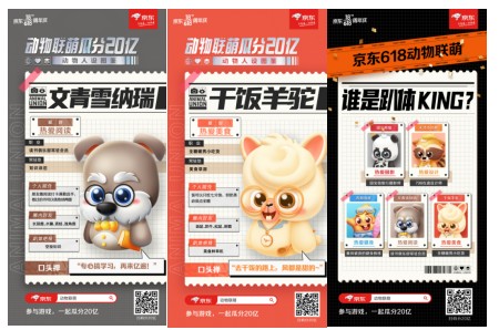 京东618“热爱狂欢趴”配备创意化的故事背景,其中“动物联萌”的IP动物设定也别具一格。35个小动物性格迥异,有热爱健身的弄潮海星、爱摄影的国宝熊猫、热爱美食的干饭羊驼、热爱阅读的文青雪纳瑞、热爱设计的天才小浣熊等等。软萌的形象设计和活泼俏皮的性格特点、霸气宣言都成功激发用户去晒、去分享给朋友们。