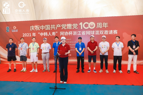 浙江省网球协会及杭州、宁波、嘉兴、湖州、绍兴、金华、衢州、丽水、舟山等各市网球协会的领导和嘉宾、中韩人寿董事长金朝萍、中韩人寿总经理桂文超共同参加了开幕仪式,金朝萍作为协办单位代表在开幕式上致辞。她提到:在庆祝建党100周年之际,中韩人寿协办此次赛事意义重大而深远。中韩人寿作为总部设在杭州的全国性保险公司,是浙江国有金控平台浙江东方金融控股集团作为主要股东发起的,可谓是咱们浙江人自己的保险公司。自2012年开业以来,中韩人寿已成为发展快速、口碑良好,为品质家庭和客户提供专业服务的寿险公司,目前在长三角区域已获得良好的市场口碑。