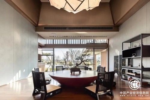 宋代黄长睿所编著杂纂丛书《燕几图》是现今可见中国最早的家具设计著作,燕几的“矩方”设计是家具进行功能性组合的核心思想,具有古代礼制文化的历史特征。由燕几图为架构的宋代家具使用空间增大,形式变化的可能性也变大;且家具方正简洁,格局和样式都具有直线条美,整体造型简约大气。李俊力依托于《燕几图》中心思想,结合现代建筑学和文人式艺术设计思维,融合当代生活元素,将银廬打造成清丽雅致的桃花源之境。