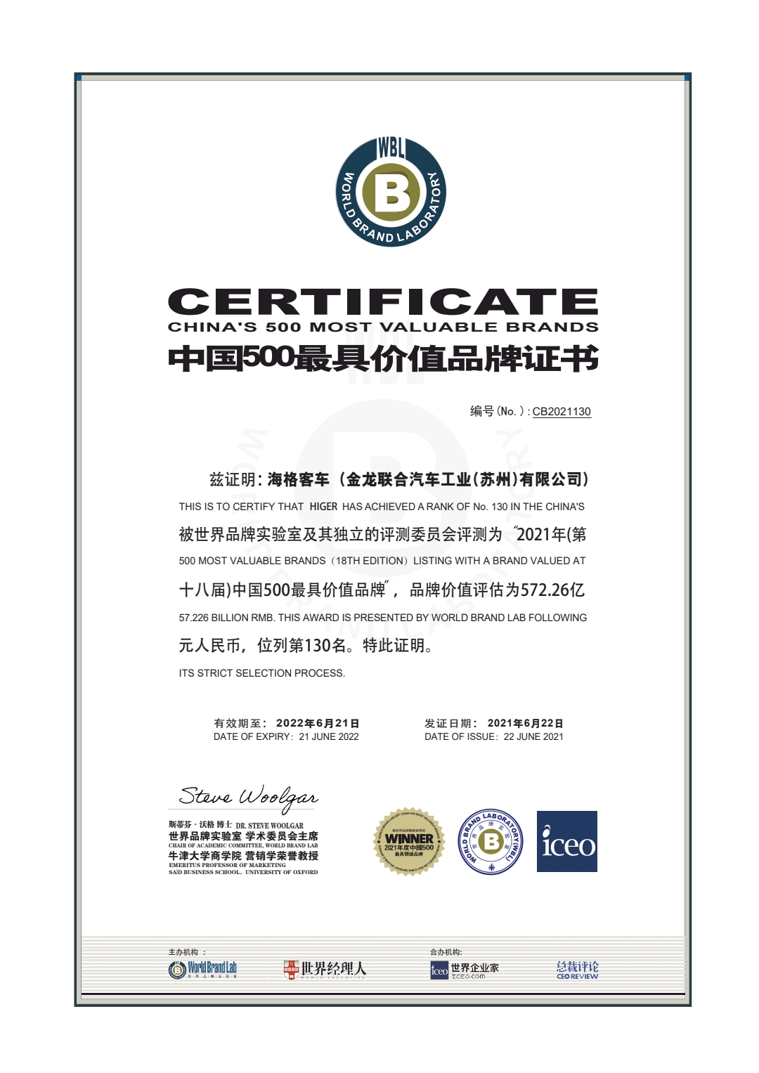 6月22日,世界品牌实验室(World Brand Lab)正式发布2021年《中国500最具价值品牌》分析报告。苏州金龙海格客车连续14年登上“中国500最具价值品牌榜”,今年以572.26亿元的品牌价值位列第130位,海格客车品牌价值在持续创新中不断增值。