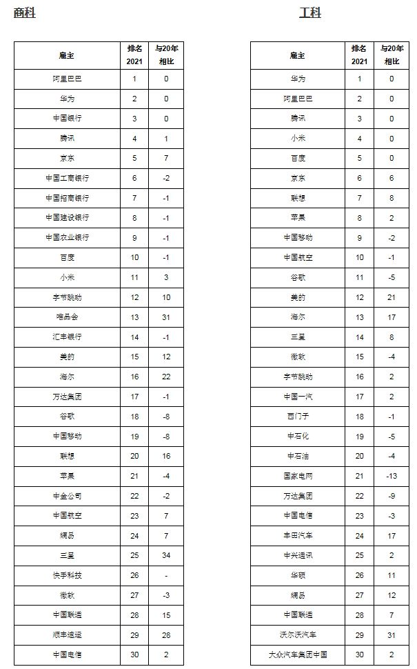 2021年中国商科及工科学生心中的最具吸引力雇主Top 30分别为: