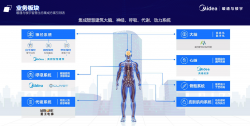 具体来看,方案将建筑的智慧化与人做类比,目标是构造出建筑的头脑、心脏、皮肤、骨骼、呼吸系统、代谢系统及神经系统,将建筑打造成为一个有温度、可感知、会思考的生命体。美的楼宇科技研究院进行信息化、数字化的大脑处理,提供顶层规划设计的全智慧服务;美控智慧建筑操控是由三大神经系统构成的数智平台;美通能源提供能源动力循环系统对建筑心脏提供造血;美的和CLIVET双品牌线的暖通空调犹如建筑的呼吸系统产生自净效力;菱王电梯负责保障物流人流信息畅通,以产生积极的运输代谢作用;再加上建筑设计、工艺结构的骨骼系统和动态感知、动作执行的皮肤肌肉系统,方案将建筑打造为城市中必不可少的有机“生命体”。