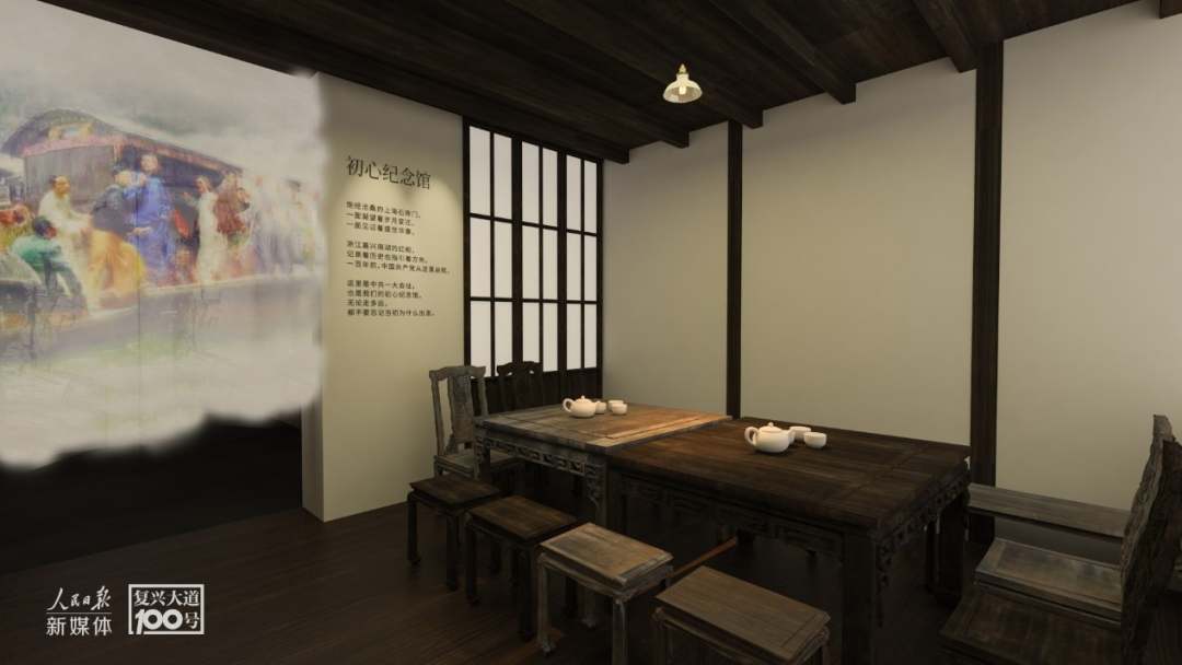 其中,初心纪念馆仿照了1921年中国共产党第一次全国代表大会的场景。几张桌子、几把椅子、一盏小灯,这种沉浸式体验,一下子把大家带回了那段百年征程的起点,让观众能够在“初心纪念馆”重温建党初期的艰辛与坚定。