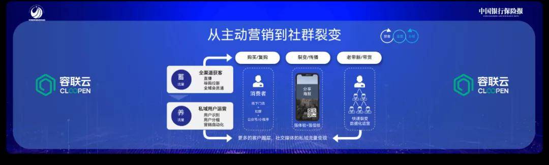 在获客端,容联云帮助企业建立以营销为视角的企业资源库,对企业自身掌握的第一手数据进行整合,以便进行细分客户的圈定和经营。容联云推出了基于私域流量营销的运营工具聚客平台,通过建立不同特征的群组进行保险理念的分享和传播,获取客户的保险需求和保障缺口,连接智能保顾的工具或者保险商城进行促成和转化。