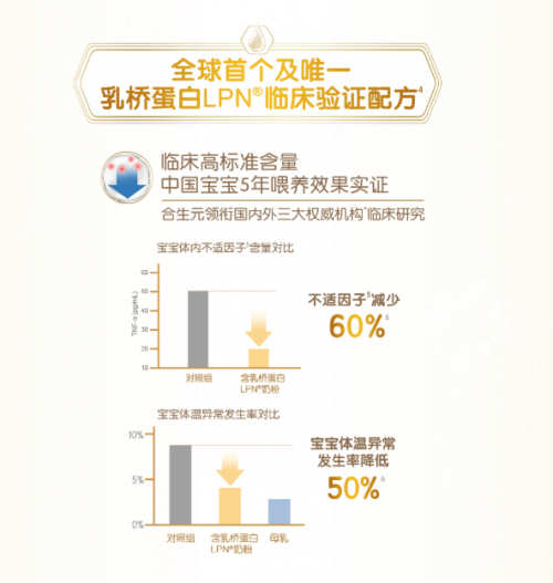 合生元是高端婴幼儿营养品牌,细节更见品牌实力和用心。蕴含乳桥蛋白LPN,乳桥蛋白LPN也是天然乳源OPN,这是乳汁中的免疫活性成分,在初乳中含量更高。有助于激发宝宝内在的保护,乳桥蛋白LPN结构很特别,像一把保护力钥匙,能解锁和激活宝宝自己的保护系统,带来双向保护:对内加强自身保护力,对外抵御外在伤害,身体更强壮。合生元派星奶粉是全球首个及唯一乳桥蛋白LPN临床验证配方,含量达临床高标准。这样的独家黑科技登上进口奶粉前十名实至名归!