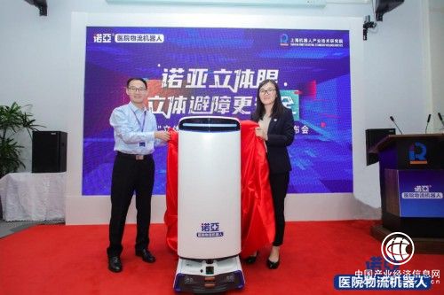 发布会现场,上海机器人产业研究院院长黄慧洁与诺亚医院物流机器人首席技术官吕威共同为新品揭幕。