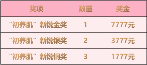 本次学院奖,七度空间特别设置企业奖项——“初养肌”新锐奖,奖励每一份用初心的创意付出。所有创作七度空间命题任意类别的作品,除参评学院奖金银铜等级奖、优秀奖入围奖评选外,还可以参与七度空间企业奖的评选,该奖项将由企业自主评审产生。一次创意,两次获奖机会,奖项设置如下: