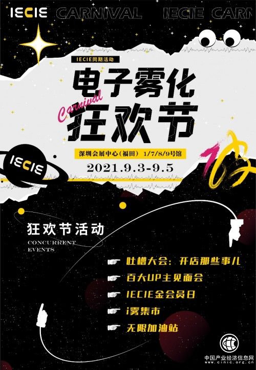 因此,2021 IECIE深圳站紧跟产品研发科技化,智能化的发展势头,以探索性和未来化的视角,融合科技、电子消费、VAPE文化、潮流等元素,全新推出IECIE 电子雾化狂欢节!