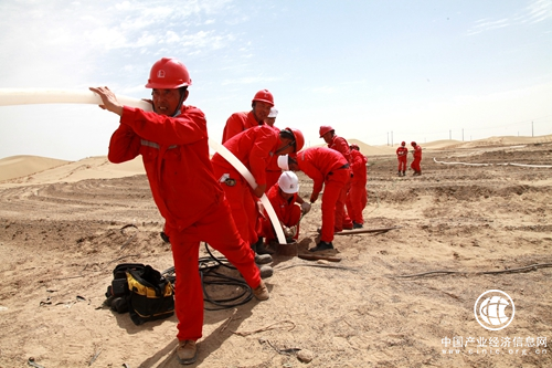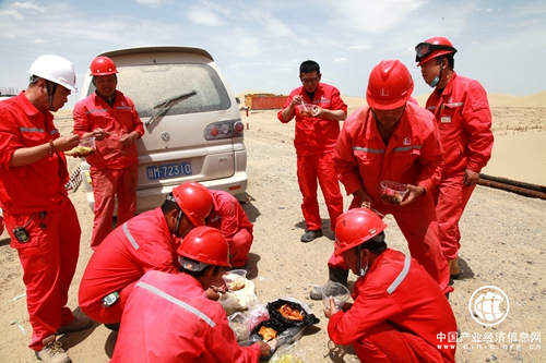 在此作业的中石化西北局采油四厂油藏经营管理一二区,干部员工在没有道路,施工车辆无法到达现场情况下,喊着“加油”的号子,采用人拉肩扛的方式,为SHB1-11、SHB1-19井下注水泵。冲天干劲如沙漠天气一样日炙日高,他们在夺取原油生产主动权,奋力跑出增储上产“加速度”。(张明江)
