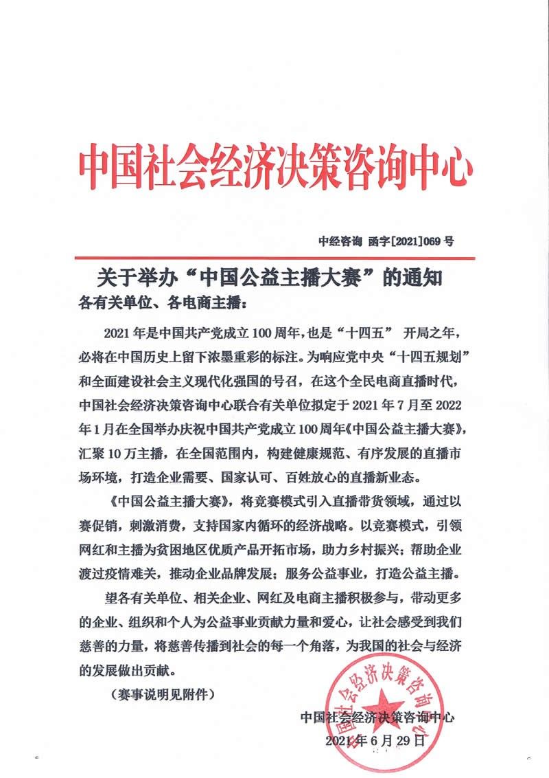 为响应党中央“十四五规划、全面建设社会主义现代化国家”的号召,在这个全民直播视商时代到来之际,中国社会经济决策咨询中心联合有关单位于2021年7月至2022年1月在全国举办“中国公益主播大赛”。助力乡村振兴战略,决胜农业农村现代化;帮助企业渡过疫情难关,推动企业品牌战略部署;服务公益事业,打造公益主播。