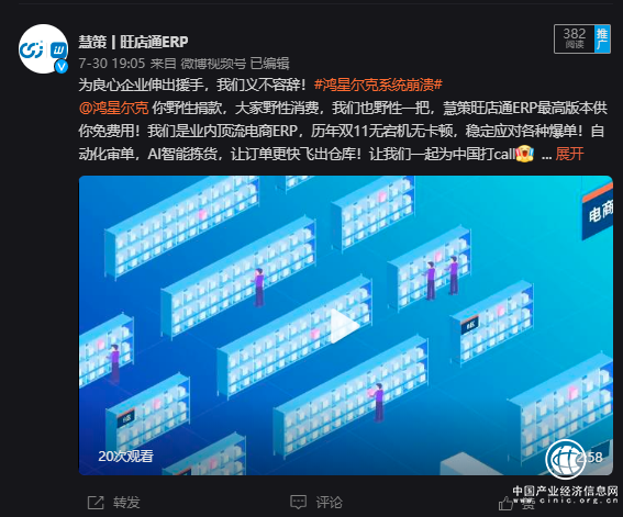 本次鸿星尔克系统崩溃致歉公告发出后,一众专业提供零售后端管理服务的服务商,便通过微博喊话鸿星尔克,愿伸出援手,免费提供系统支持。定位一体化智能零售服务商的慧策在官方微博中也表示要“野性一把”,以历年双11无卡顿无宕机的成绩保障,“将慧策旺店通ERP最高版本免费提供”!
