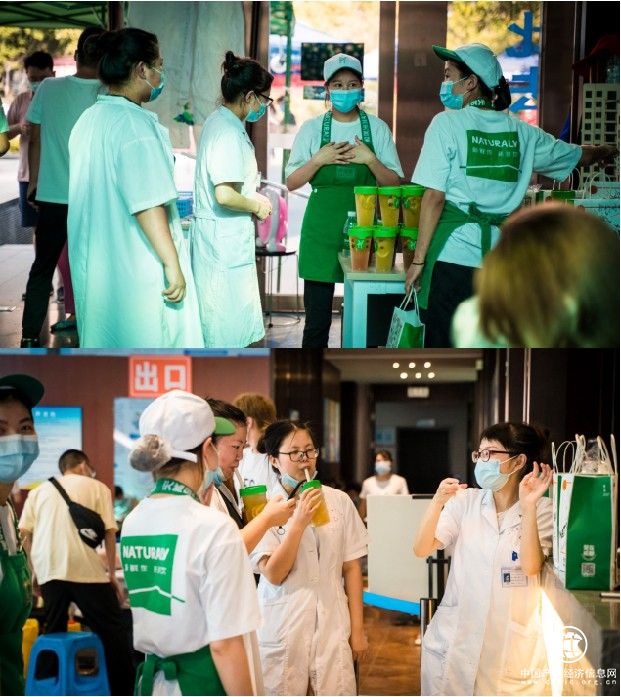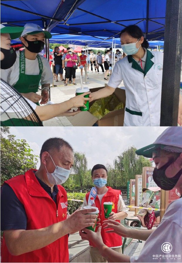 在绵阳,记者现场直击----天然呆奶茶门店工作人员冒着38度高温,为一线核酸检测人员及社区志愿者发放免费解暑饮品。