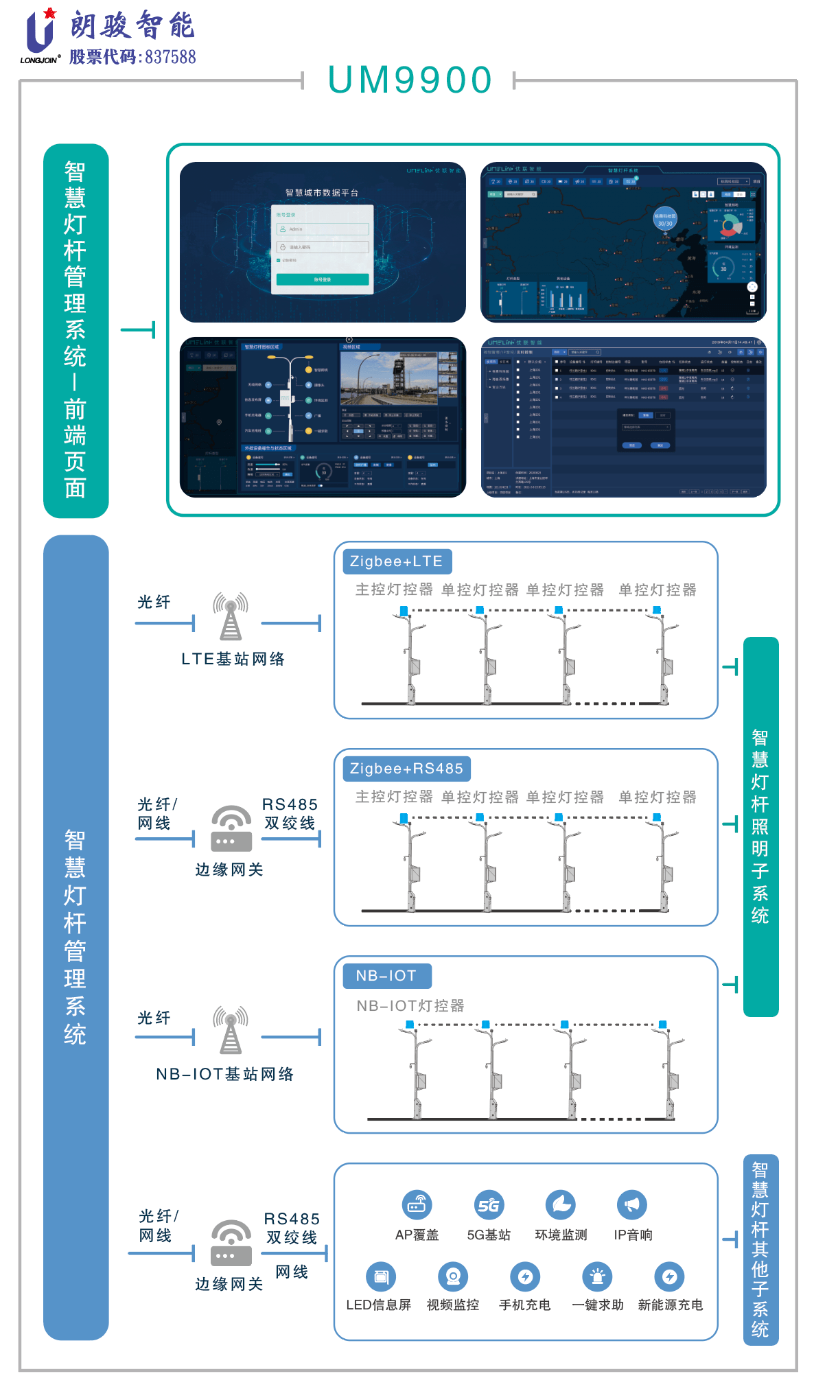 另外,朗骏智能这次带来的系统为旗下子公司优联智能自主研发的UM9900智慧灯杆管理系统,该系统囊括了两个大板块的业务内容: