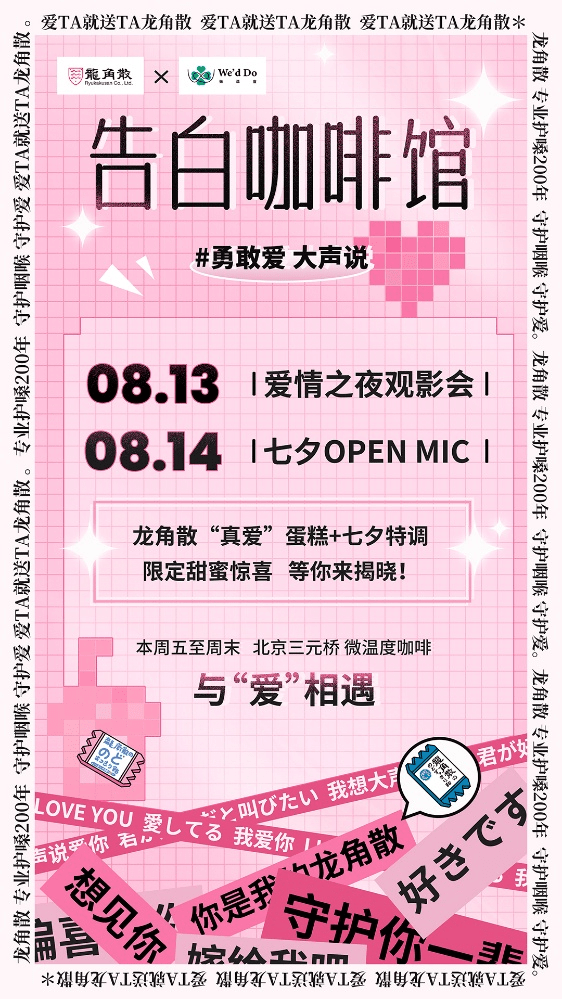 爱要细心耕耘,更要勇敢表达。8月6日至11日,龙角散在全网发起了主题为“勇敢爱大声说”的七夕告白征集活动,鼓励大家勇敢表达爱意,回忆爱的甜蜜瞬间。截至8月11日,活动已征集近千名网友的甜蜜告白,龙角散精选部分真情告白打造了独一无二的甜蜜告白展,并欢迎每一位来到“告白咖啡馆”的用户亲手写下自己的告白,让自己的心声被所爱之人听到。