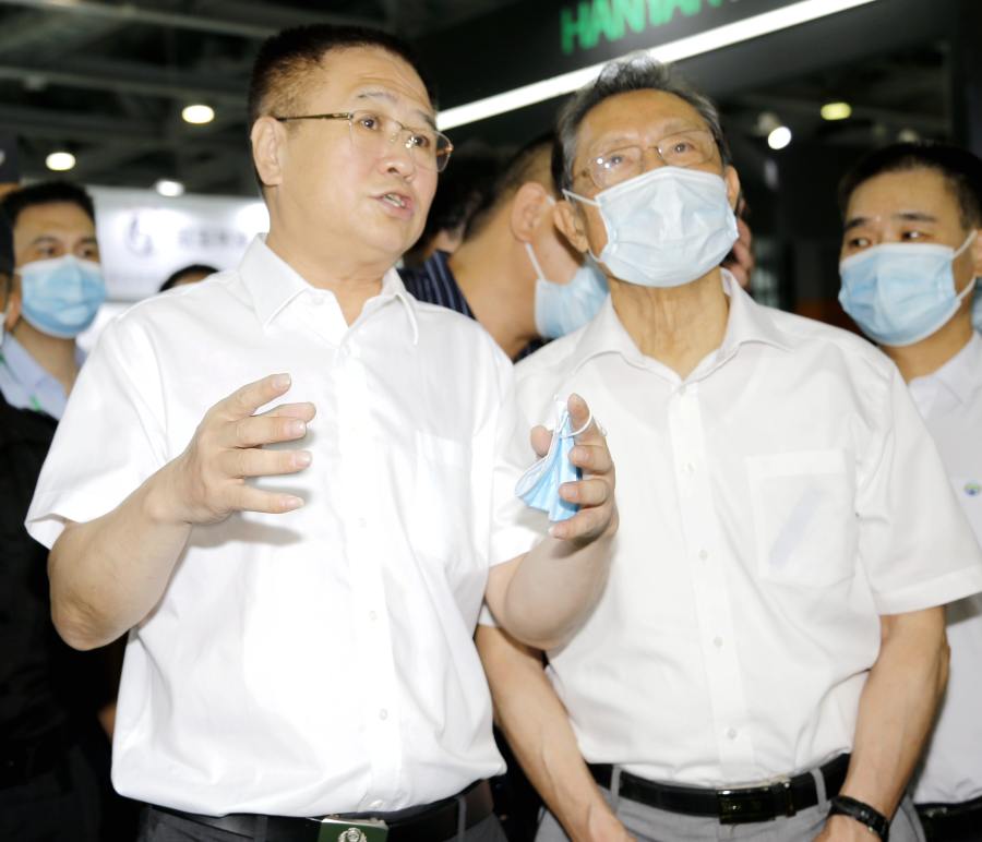 图为:国港通(北京)数字科技有限公司董事长刘明(左)向中国工程院院士、共和国勋章获得者、中国室内空气净化品牌集群主席钟南山(右)介绍国港通微生物厨余垃圾处理机