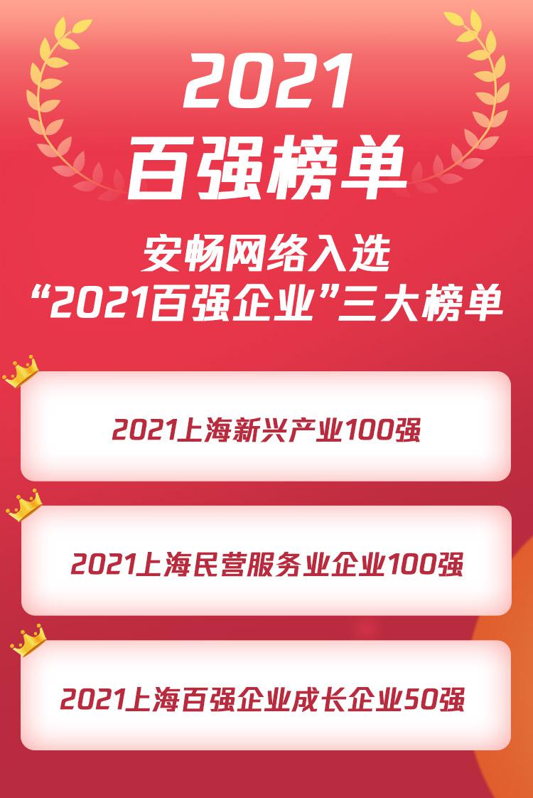 备受关注的2021上海百强企业榜单发布。上海安畅网络科技股份有限公司(以下简称“安畅”)荣登“2021上海新兴产业100强”“2021上海民营服务业企业100强”榜单,同时凭借2020年营业收入高速增长入围“2021上海百强企业成长企业50强”,充分展现公司发展的强劲势力。