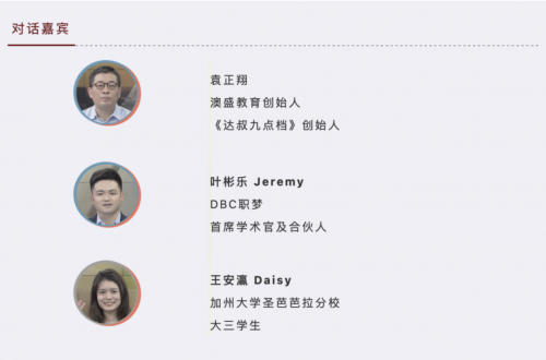 澳盛教育创始人袁正翔、加州大学圣芭芭拉分校Daisy、也将于节目中一起探讨“后疫情时代,留学生如何求学求职?”,并为广大留学生提供实用建议,帮助留学生们在困难的求职环境中脱颖而出。