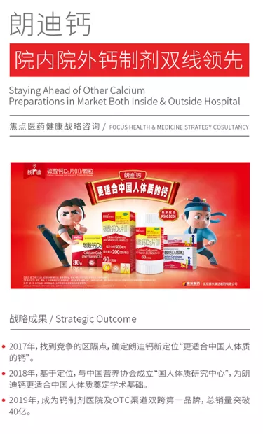 此外,还有和焦点品牌合作超过3年的振东制药,焦点帮助其品牌朗迪钙找准了新定位,制定了新传播方案。焦点品牌提出“朗迪钙,更适合中国人体质”的战略机会,并大力推动建立了“国人体质研究中心”。在传播资源有限、广告传播效能较低的情况下,焦点聚焦于分众式投放,饱和式传播,在短时间内提高了品牌知名度,在终端促进围绕“更适合中国人体质”的理念向顾客进行推广,在新媒介传播中围绕新的品牌机会向顾客传递国人强、中国强的价值观,到2019年,朗迪已成为钙制剂医院及OTC渠道双跨第一品牌。