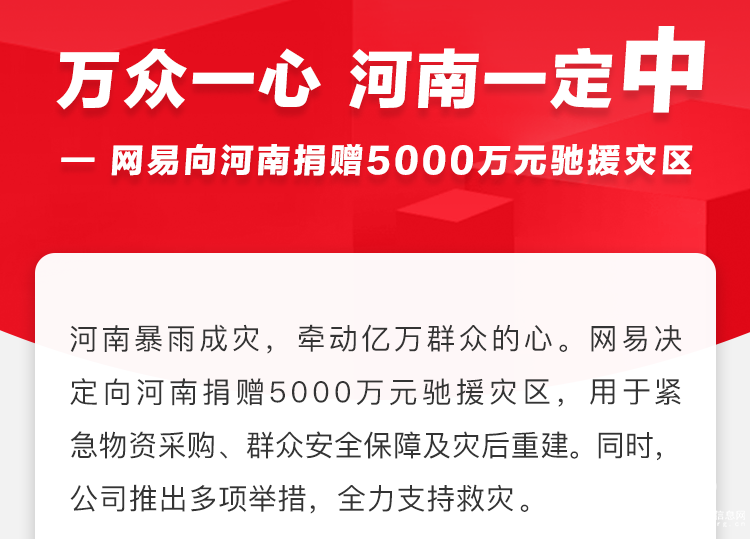 今年7月,河南暴雨牵动亿万人心。面对重大灾情,网易宣布捐款5000万元驰援灾区。随后,网易《大话西游》宣布为河南抗洪救灾捐赠100万元;《逆水寒》则以全体玩家名义联动河南嵩山少林寺共同出资200万元,用于帮扶灾区农村儿童。网易新闻与网易云音乐发起公益演唱会,收入全额捐赠郑州红会。