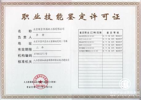 早在2012年绿京华便获得了职业技能鉴定资格,绿京华职业技能培训鉴定站是经中华人民共和国人力资源和社会保障部授权许可的专业培训鉴定机构,负责园林行业职工职业技能培训鉴定工作,并提供职业技能培训和技能鉴定咨询服务。鉴定站拥有一批业务精通、技术过硬、职业道德优良的考评员和培训师资队伍,督导员、考评员和讲师均是园林、草业、花卉园艺专业的知名专家,具有丰富的理论知识和实践经验,不仅为学员提供一流的技能培训工作,并且在农业农村部的指导和监督下,顺利完成了草坪建植工、草坪管护工、草坪检测工、绿化工、育苗工、花卉工等工种五个等级的培训鉴定(初级工、中级工、高级工、技师和高级技师)工作。学员经理论和实际操作考核合格后,可取得中华人民共和国人力资源和社会保障部颁发的职业资格证书,累计参加培训评价达到1.07万人次。