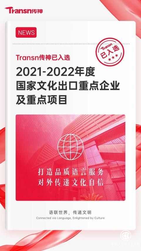 日前,传神语联子公司语联网(武汉)信息技术有限公司成功入选由商务部、中央宣传部、财政部、文化和旅游部、广电总局五部委组织认定的“2021-2022年度国家文化出口重点企业”,“国际影视文化译制服务平台”入选“2021-2022年度国家文化出口重点项目”。