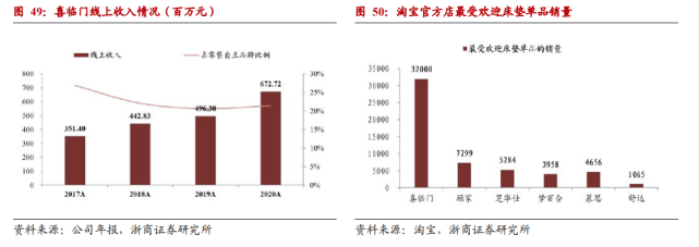 浙商证券认为,渠道扩张(包括线下门店和电商)和品牌营销推广,是当前中国床垫龙头跑赢行业、实现集中度提升的胜负手;而内销床垫伴随渗透率提升、翻新需求兴起有望保持双位数的增长。喜临门作为床垫第一股,内销自主品牌业务保持高增,线下高速开店+电商霸主地位牢固,同时品牌营销方面持续把自己打造为国民品牌形象,有望后续份额角逐中率先取得优势。