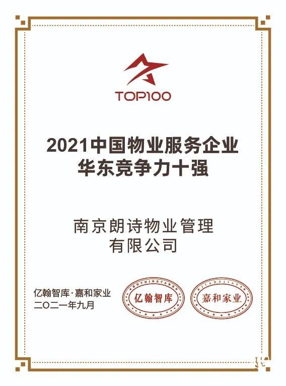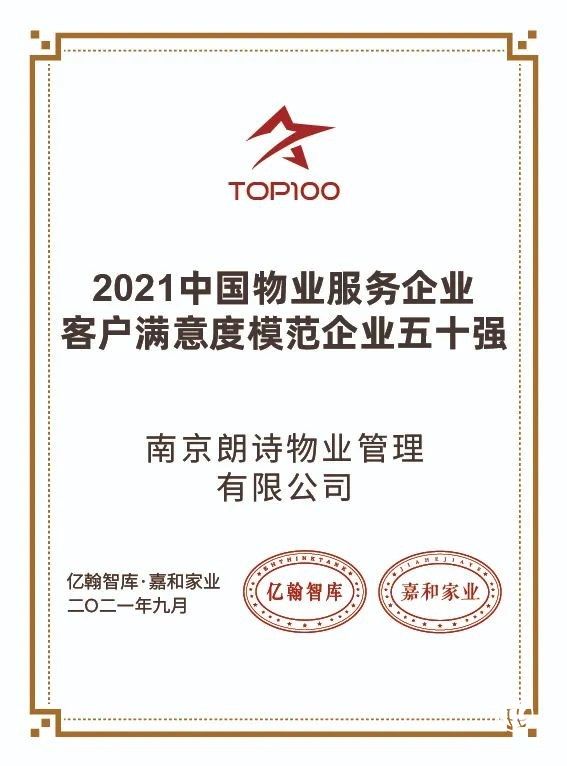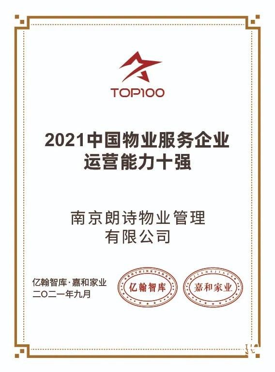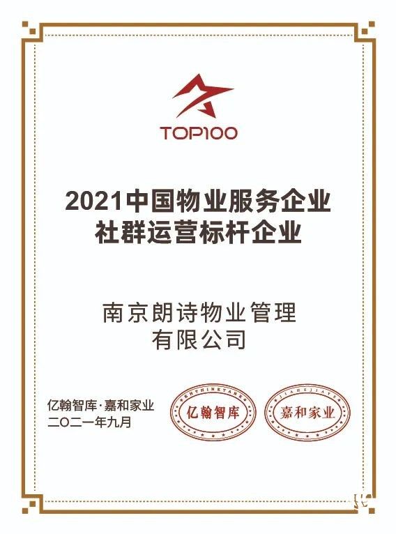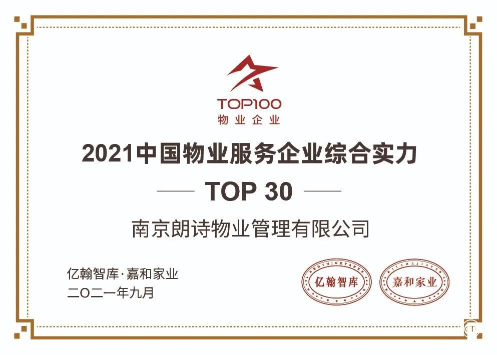 在由亿翰智库、嘉和家业主办的“ 2021中国房地产业战略峰会暨2021中国物业服务企业百强峰会”上,朗诗绿色生活荣获“2021中国物业服务企业综合实力TOP30”“2021中国物业服务企业客户满意度模范企业五十强”“2021中国物业服务企业华东竞争力十强”“2021中国物业服务企业运营能力十强”“2021中国物业服务企业社群运营标杆企业”五项荣誉。