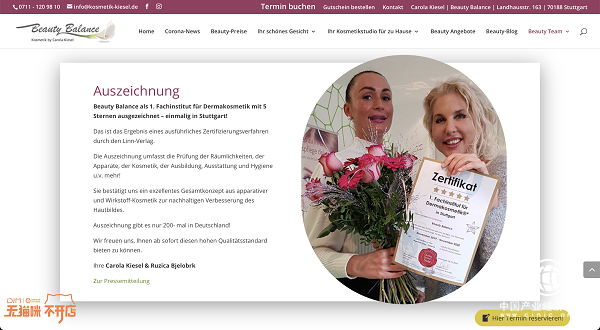 德国著名美容院(Beauty Balance),是从1995年创立并延续至今的“德国明星美容院”,为此德国美容研究院还为Beauty Balance颁发了“Derma-Beauty-Star”奖项,全德国仅200家美容院拥有,在德国美容业界享有很高的荣誉。