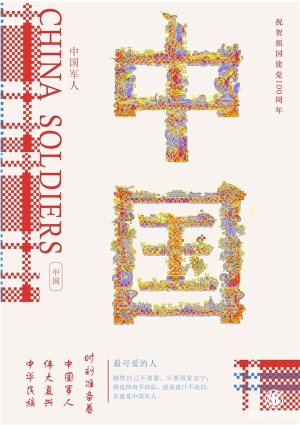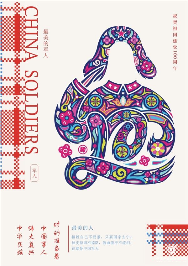创意思想:中国军人这个作品上面两个字是采用一些传统建筑物和传统人物服装拼成的,下面军人是采用军人的形象与100这个数字结合,庆祝建党一百周年。