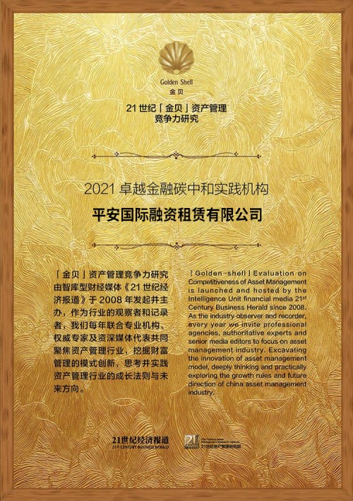 9月17日,由《21世纪经济报道》发起并主办的2021中国资产管理年会暨十四届21世纪"金贝奖"资产管理竞争力研究学术盛典在上海举行,平安国际融资租赁有限公司(以下简称"平安租赁")以在绿色金融领域的深入实践,荣获"2021卓越金融碳中和实践机构"奖。