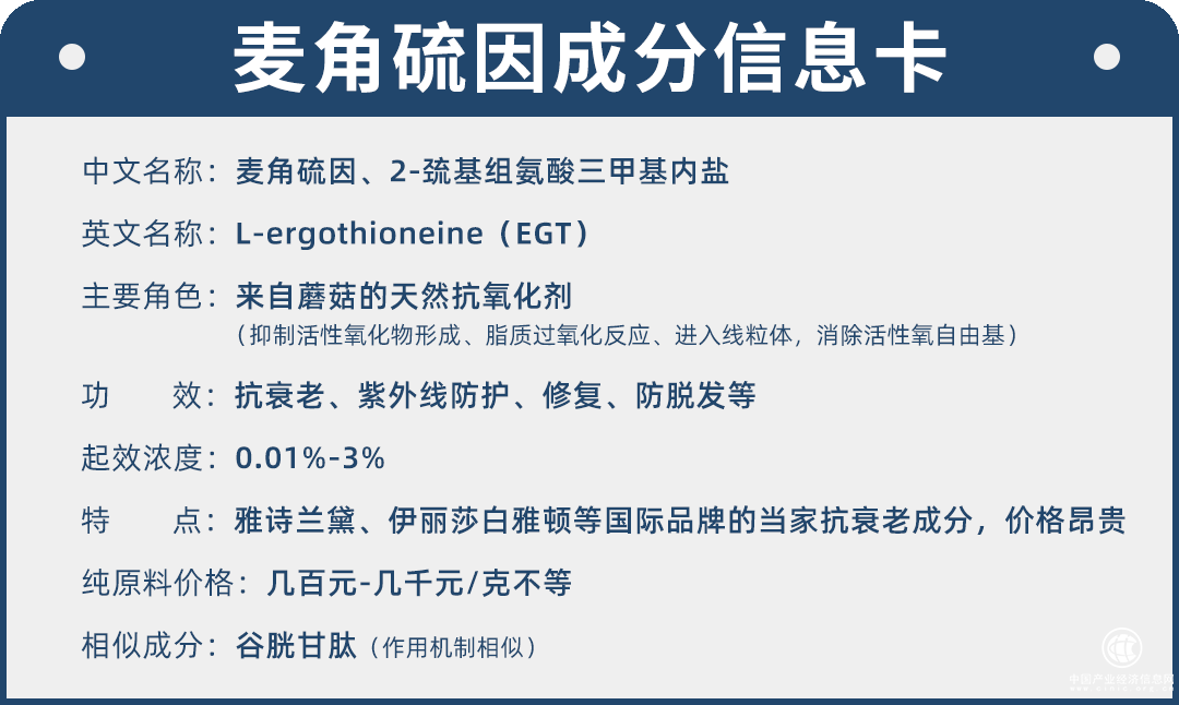 麦角硫因是一种稀有的含硫氨基酸,是人体中天然存在的细胞保护剂和抗氧化剂,具有抗光老化和抗氧化作用。但这种功效强大的超级抗氧化剂,人体自身不能合成,只能通过外部获取。而随着年龄的增长,人体内的麦角硫因含量会逐渐降低。