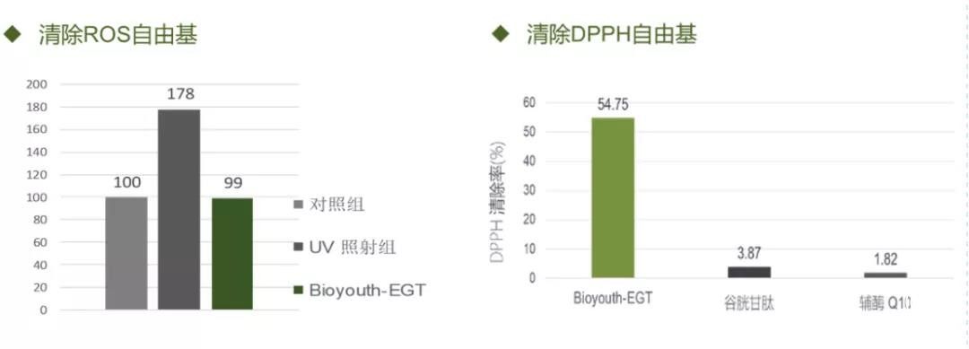 据华熙生物的检测数据,麦角硫因Bioyouth™-EGT具有显著的抗氧化性,1.3%Bioyouth™-EGT的DPPH自由基清除能力是同等浓度谷胱甘肽的14倍,辅酶Q10的30倍。通过体内试验发现,Bioyouth™-EGT可显著减少色素沉积,起到美白提亮的功效。