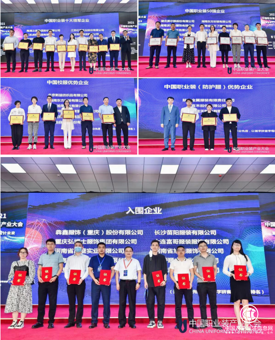 第三届中国职业装优势企业评价推介活动评审结果现场揭晓,入选“中国职业装十大领军企业”、“ 中国职业装五十强企业”、“ 中国校服优势企业”、“ 中国职业装(防护服)优势企业”、“ 入围企业”名单的企业代表先后上台领奖,感受属于自己的荣耀时刻。