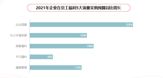 为给员工带来更好的体验,企业不仅越来越重视员工对福利的内在需求,也越来越舍得为员工福利“花钱”。报告数据显示,近年来企业不断加大对员工福利的预算投入,近55%的企业采购预算提升超过20%,特别是茶歇、办公环境改善及健康管理方面等“新福利”的预算增速更是超过了100%。