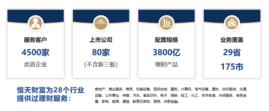 在近几年的经济发展和金融出清中,恒天财富深耕企业金融服务领域,助力企业基业长青,在2019年推出首个企业金融服务品牌——企金会,以“为企业提供全面金融服务”为宗旨,从金融顾问、研究顾问、产业顾问、法律财税顾问服务四个方面全面为企业客户提供专业服务。