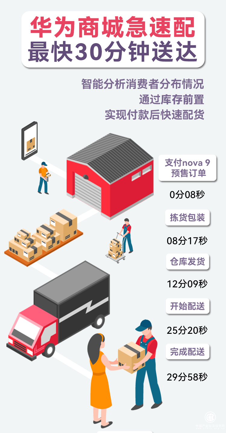 10:08完成支付、10:13安排发货,10:15极速送前置仓正式发货,10:31正式签收。在9月29日的华为nova 9首发日,一场极速速递在深圳悄悄上演,华为商城nova 9系列第一单仅用时不到半小时就送到深圳消费者手中。