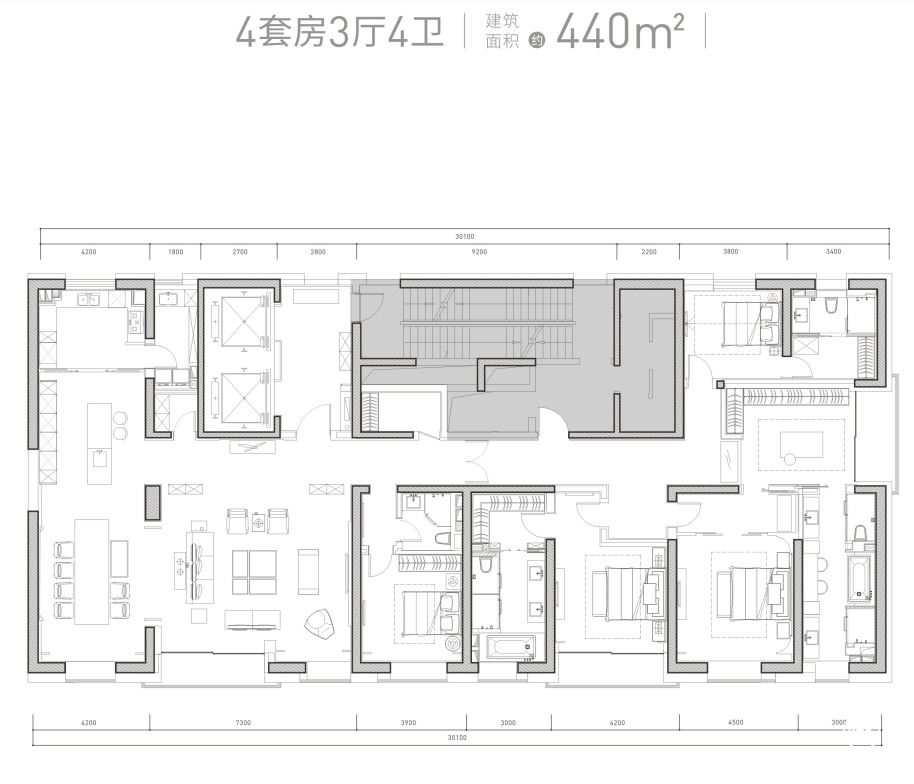 家族根系浩大,人生才得丰茂。基于传统的人居主义,家族大宅被认为是居住的终极目标,在传承家族精神的同时,更引领生活形态的不断更新,被赋予高阶生活的使命与哲思。在传统西安楼市生活之上,万瑞府立于城市极值中心,以打造约440㎡大平层,将重叠繁复的家族生活铺陈开来,潮流与隽永在超前的尺度中碰撞,延伸出传世人居的腔调。