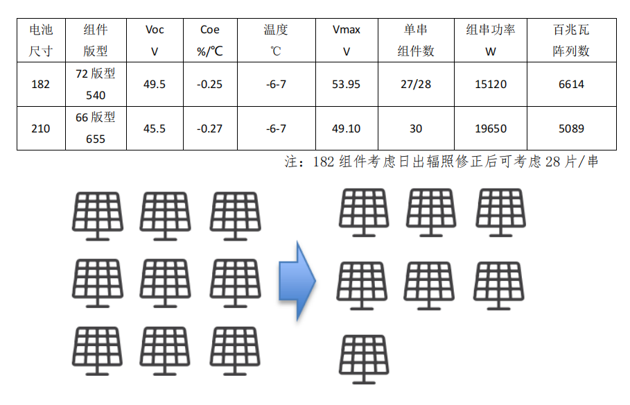 同时,实验也表明同系统电压下,210串联的组件更多,组串功率更高。大尺寸明显的优势在于尺寸越大,随之而来的是阵列数量的减少,支架、基础用量的减少。这与电站设计时使用限压器、系统电压从1000V 变为 1500V、158 跃进到 166/182/210 有着异曲同工的效果。