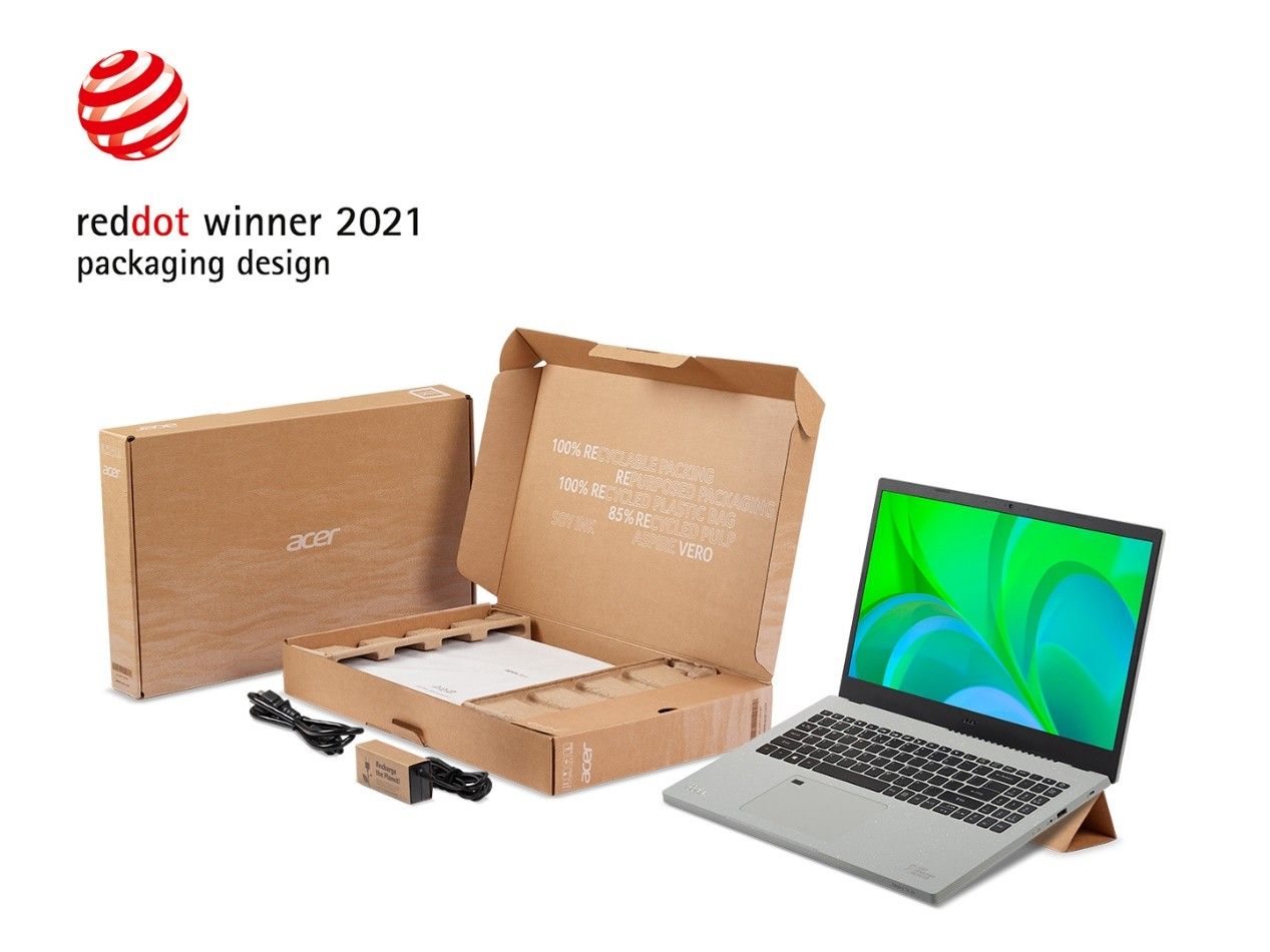此次蜂鸟·未来 环保版可再生包装,采用100%可回收再生纸,且所有印刷品均使用大豆油墨,可自然分解不会污染环境,包装中的适配器挡板可作为笔记本支架使用,增加使用舒适度的同时让用户切身参与到环保行动中来; 对持续发展的追求是共通的, 以“促进环境和人类和谐的设计”为理念的红点奖,历来重视能够促进环保的设计,此次蜂鸟未来环保版包装的巧思设计与红点奖理念相契合,因此荣获2021红点包装设计奖,为宏碁的环保事业在添殊荣。