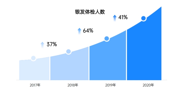 善诊数据报告显示,过去4年间,我国银发人群体检数量呈明显递增趋势,最大年增幅达64%。随着银发族生活质量与健康意识的普遍提升,其健康投资意愿也在不断增加。
