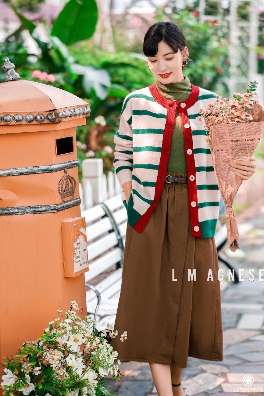 除了碎花,条纹也是时装设计师最爱的元素之一。简爱格妮斯这款撞色条纹针织衫搭配咖色半身裙和墨绿色针织打底衫,一套搭配很好地诠释了Easy Chic。内搭和外套质地都非常柔软顺滑,细腻的织线给出行的人们带来了极高的亲肤性与透气性。整套风格慵懒中带了点随性,优雅中带了点知性,出游穿在身上足够亮眼吸睛。