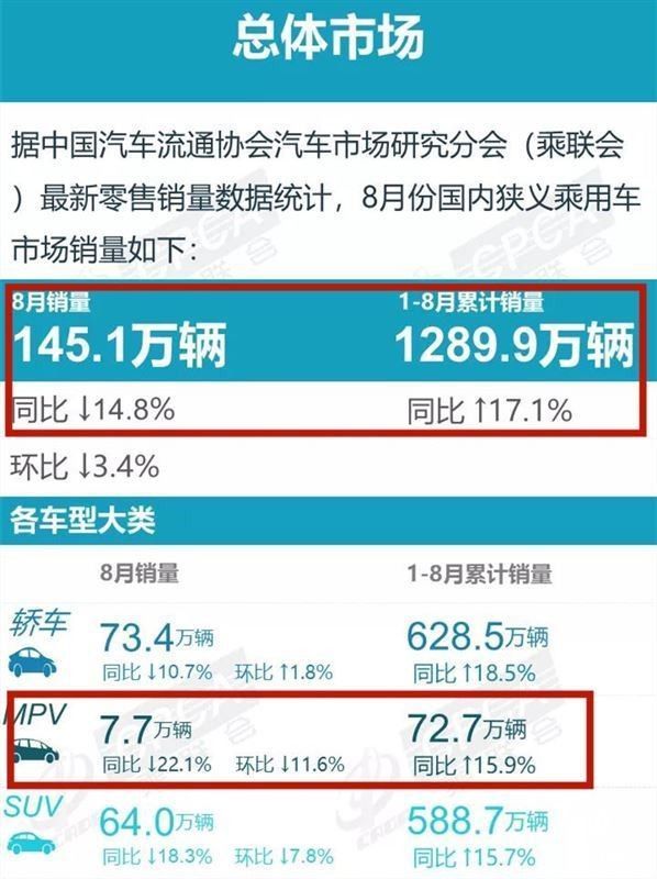 现如今,随着国内汽车市场消费的升级和国家三孩政策的放开,乘坐舒适性更加出色、安全性能更高的高端MPV车型也因此越来越受到市场和消费者的欢迎。根据乘联会最新销量数据显示,今年8月我国MPV车型总体销量为7.7万辆,同比减少22.1%,环比减少11.6%。值得注意的是,今年1-8月份国内MPV车型总体累计销量72.7万辆,与去年同期比增长15.9%,从这些数据上可知中国MPV市场目前是处于销量增长的状态,意味着选择MPV车型的消费者越来越多,需求也正在逐渐增大。