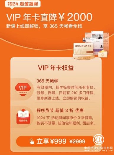 据了解,极客时间VIP年卡的优惠是平台推出的“1024超值福利”活动中的重磅,按照平台的规则,网友们在10月30日之前购买VIP年卡可获得直降2000元的特权,原价2999元的年卡仅需999元就可以够得,有效期内持有此卡可以畅学平台二百多门课程!得知了这一消息的小伙伴纷纷趁着活动的机会进行抢购,如此巨幅的优惠活动实属罕见!