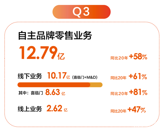 单Q3而言,喜临门实现营收19.4 亿元,同比增幅31.1%;归母净利润1.6亿元,同比增幅13.4%;扣非后归母净利润1.5 亿,同比增幅10.1%,营收、利润均超行业预期。值得一提的是,Q3自主品牌业务营收达12.79亿元,同比2020年增幅为58%。其中,仅喜临门品牌实现营收8.63亿元,同比增幅为81%。