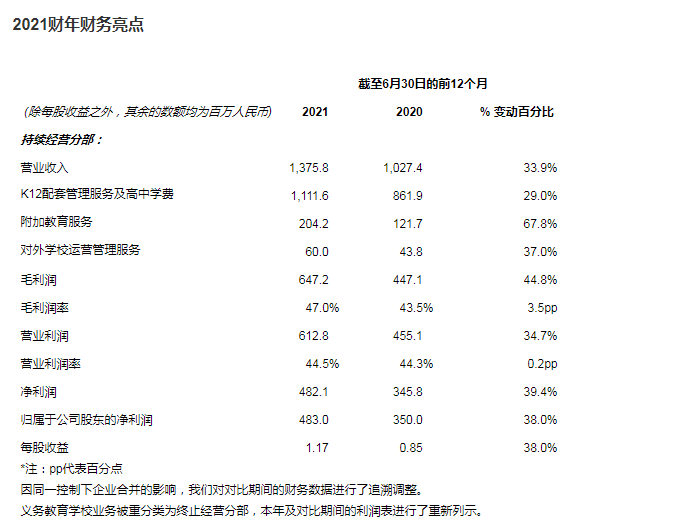 K12配套管理服务及高中学费主要包括公司向学生提供的住宿、课后服务及高中教学服务。2021财年的K12配套管理服务及高中学费营业收入为人民币11.116亿元(1.722亿美元),较去年的人民币8.619亿元增长29.0%。这主要得益于学生人数以及生均收费均同比增长。